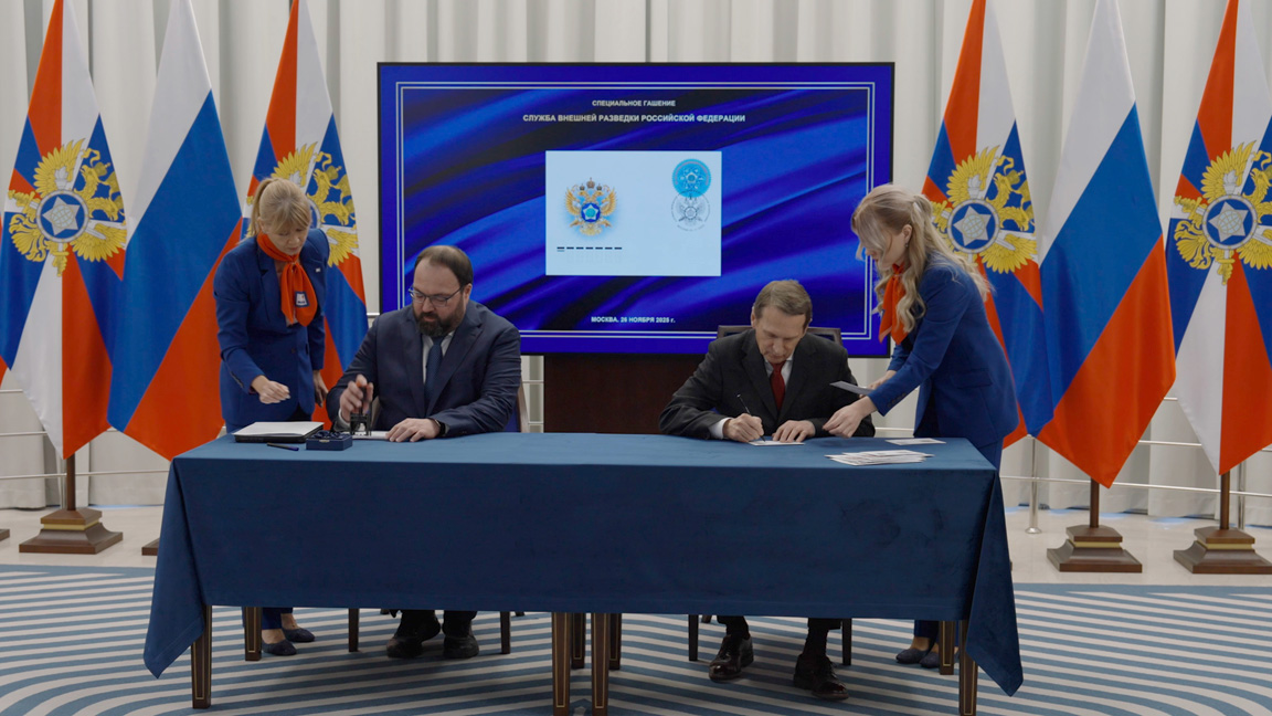 26 ноября в штаб-квартире СВР России прошла церемония памятного гашения почтовых марок, приуроченных к 80-летию Победы в Великой Отечественной войне и посвящённых разведчикам И.Р. Григулевичу, А.М. Короткову, В.А. Лягину, Н.А. Прокопюку, Н.В. Троян, П.М. Фитину, а также почтовой марки «100 лет научно-технической разведке России». В торжественном мероприятии приняли участие Директор СВР России С.Е. Нарышкин, министр цифрового развития, связи и массовых коммуникаций РФ М.И. Шадаев.