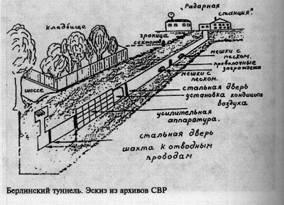 Тем временем, не подозревая о том, что советской разведке уже было известно о результате их замыслов, американцы и англичане форсировали завершение строительства. В берлинском районе Альтглинике, где проходила граница американского сектора Берлина, американские военные власти построили корпуса станции подслушивания. От них был прорыт пятисотметровый туннель, оборудованный по последнему слову техники, для подключения подслушивающей, усилительной и прочей шпионской техники к телефонным кабелям на территории ГДР. Это было внушительное сооружение — под землей можно было свободно ходить и передвигать тележки с аппаратурой. Через подземный ход пролегали кабели, соединяющие советские военные коммуникации с американским центром обработки данных. Туннель был подведен к колодцу, через который тянулись телефонные и телеграфные линии из советского посольства, Верховного командования в Берлине, а также правительственные линии связи ГДР. О масштабе прослушивания говорит такой факт: ежедневно несколько десятков катушек с записью телефонных переговоров отправлялись самолетом в Лондон, где обрабатывались голосовые записи, а телеграфные сообщения отправлялись на дешифровку в США.