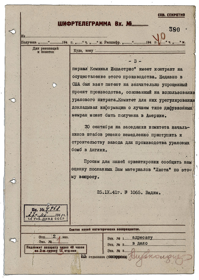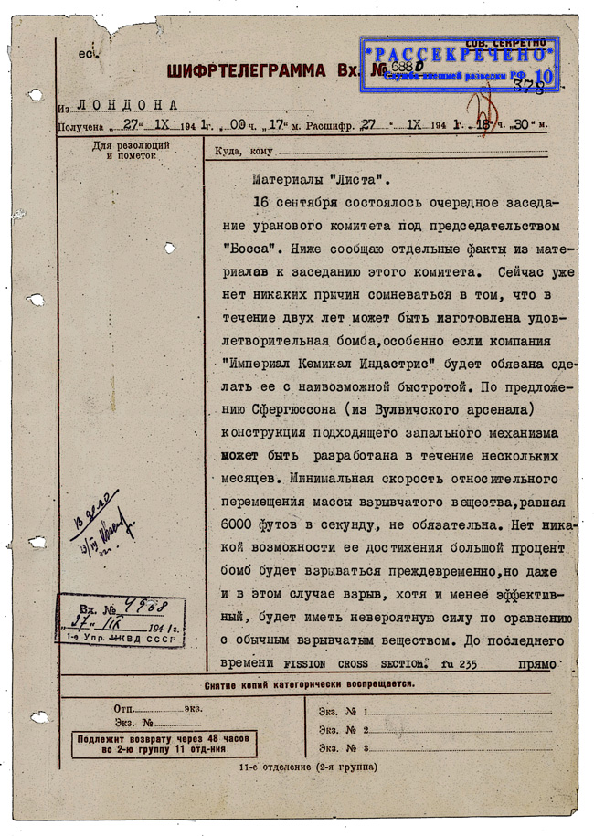 Проведение в СССР работ по делению атомного ядра и их возможное военное применение опиралось на солидный теоретический фундамент и высокий уровень исследований отечественных ученых, однако в вероятность создания атомной бомбы в обозримом будущем тогда еще мало кто верил. Но 25 сентября 1941 года член легендарной «Кембриджской пятерки» Джон Кернкросс (псевдоним «Лист») передал материалы состоявшегося совещания английского Комитета по урану о работах по созданию атомного оружия. Кернкросс был личным секретарем лорда Мориса Хэнки, занимавшего пост председателя Британского комитета по науке и министра без портфеля «военного кабинета».