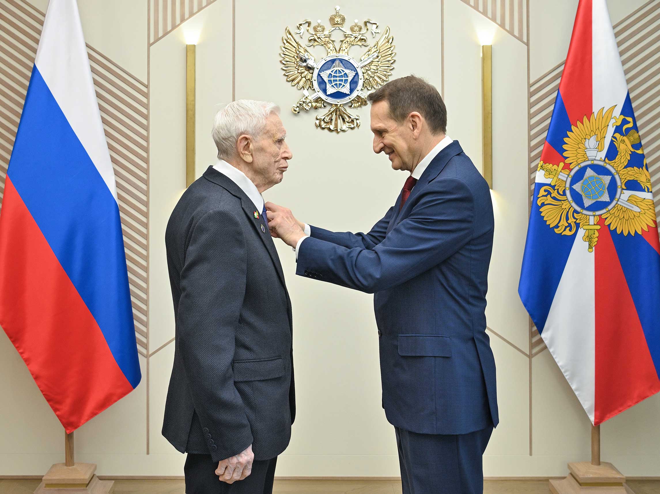 Юбиляра принял лично Директор Службы. За многолетнюю безупречную службу в разведке С.Е. Нарышкин вручил Василию Степановичу ведомственную медаль «За заслуги».